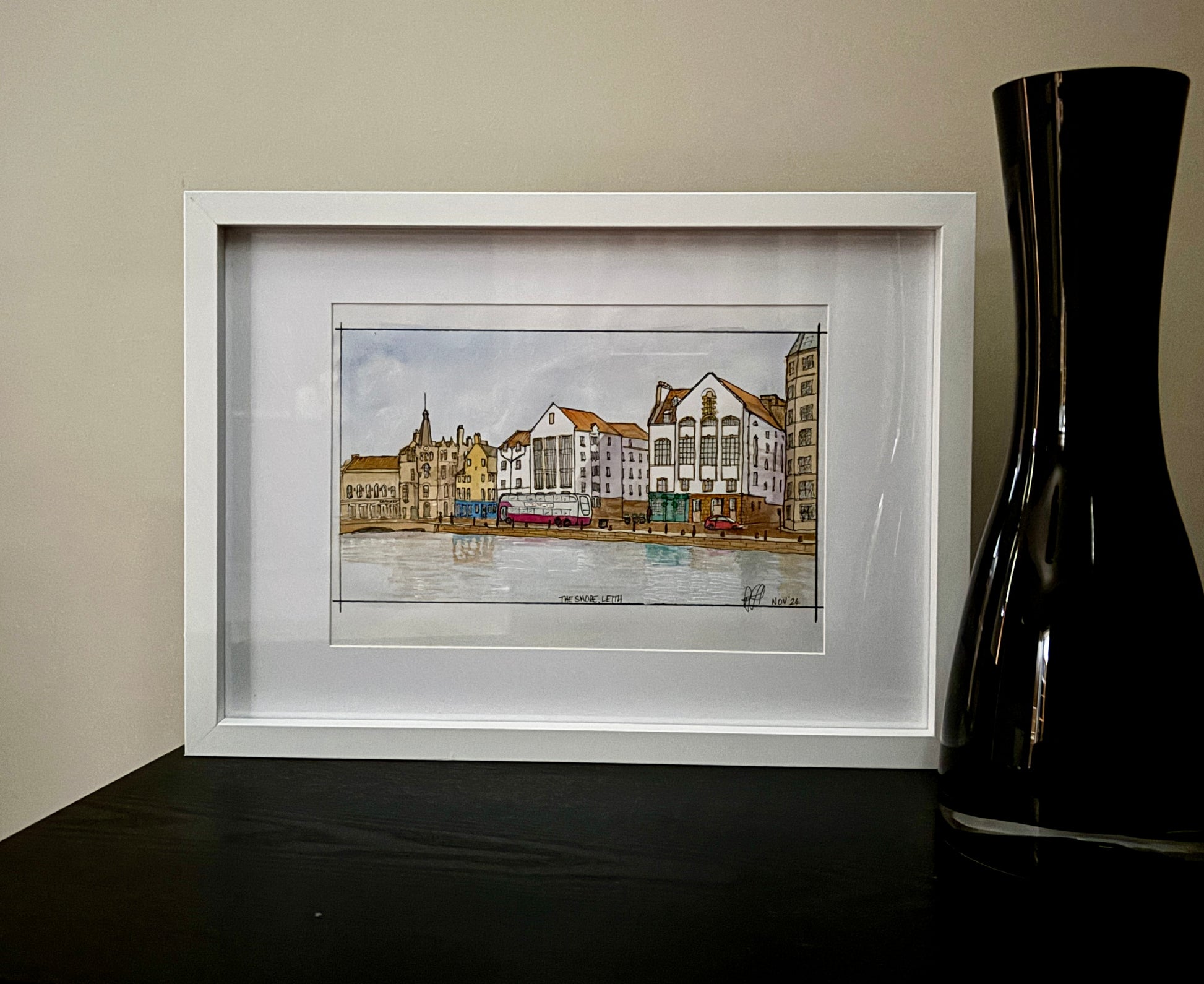 The Shore in Leith, Edinburgh street scene, looking across the Water of Leith. Actual size 28cm x 16cm. Original watercolour and ink sketch £95. Print £35